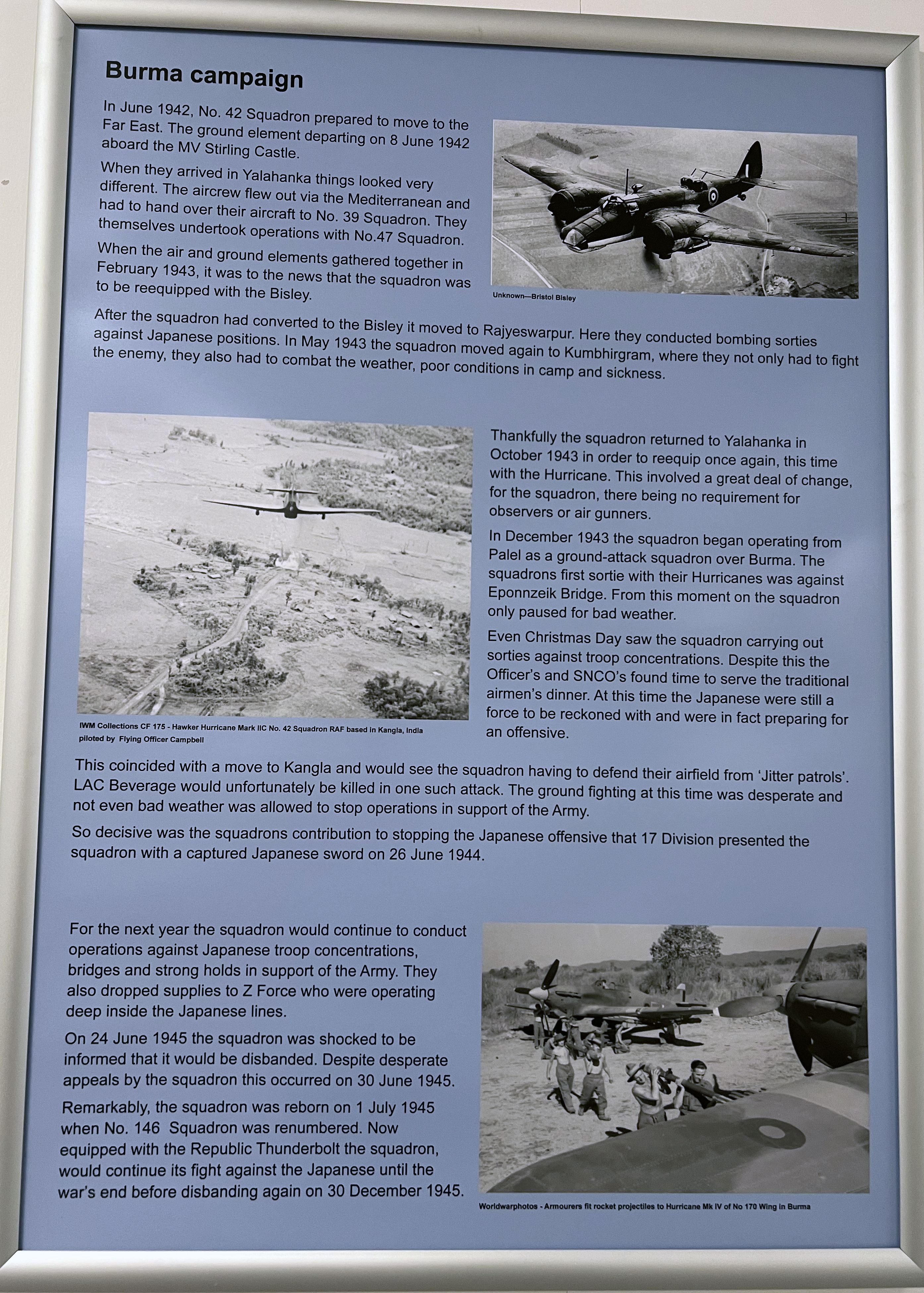 After the squadron had converted to the Bisley it moved to Rajyeswarpur. Here they conducted bombing sorties against Japanese positions. In May 1943 the squadron moved again to Kumbhirgram, where they not only had to fight the enemy, they also had to combat the weather, poor conditions in camp and sickness.