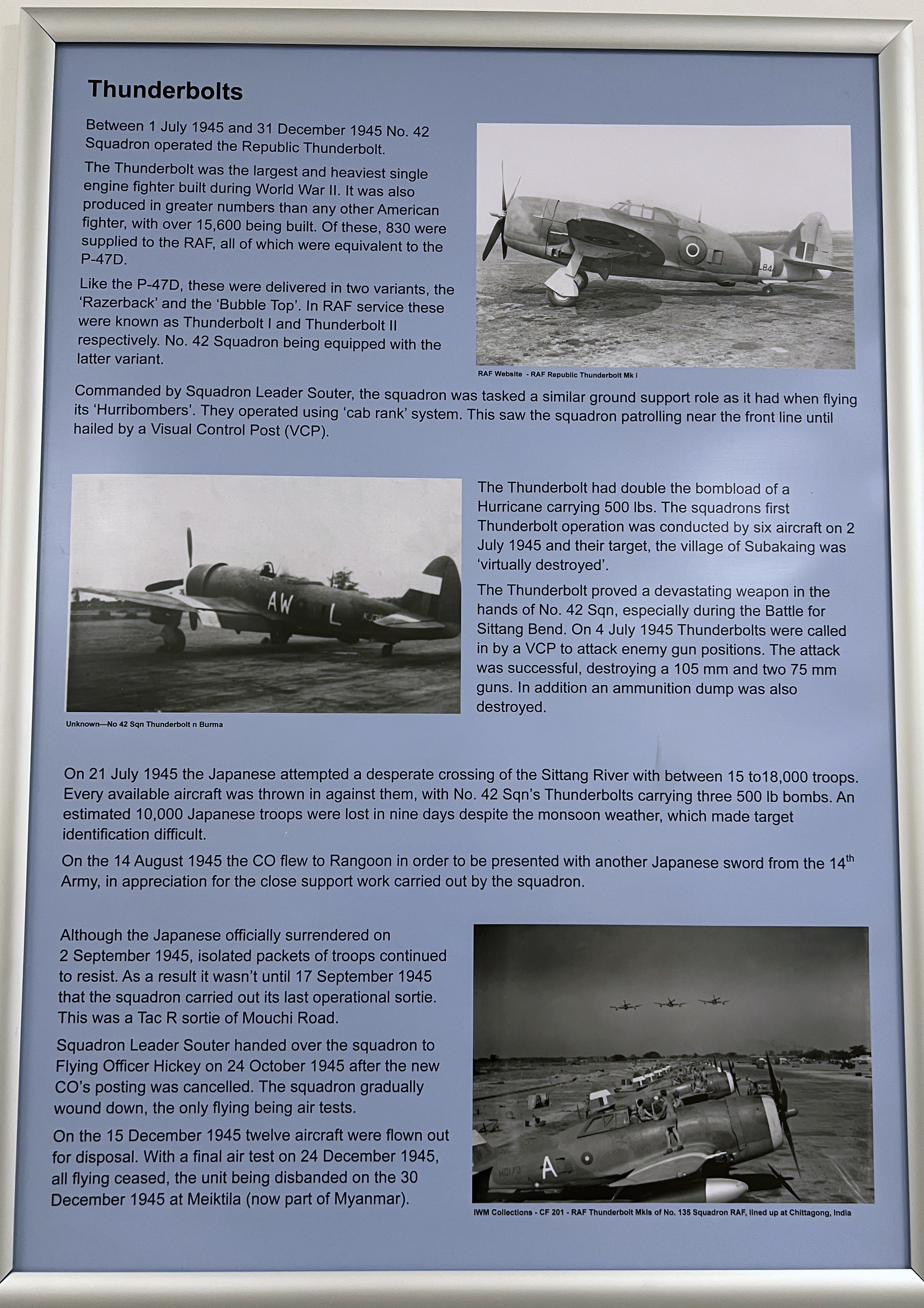 Remarkably, the squadron was reborn on 1 July 1945 when No. 146 Squadron was renumbered. Now equipped with the Republic Thunderbolt the squadron would continue its fight against the Japanese until the war's end before disbanding again on 30 December 1945.